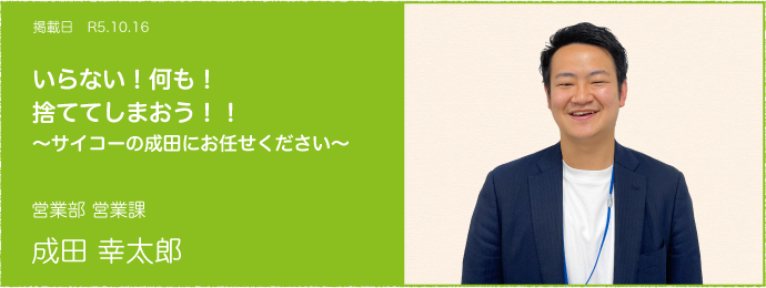 成田)今やっている仕事を幅広くというか、今現在足りない知識をもっと深めるだけでなく、廃棄物、リサイクル問わずにお客様から何でも成田さんに任せればと安心と思ってもらえるようになって、将来的にはサイコーの中心的な存在になって活躍していけるようになりたいなと思います。